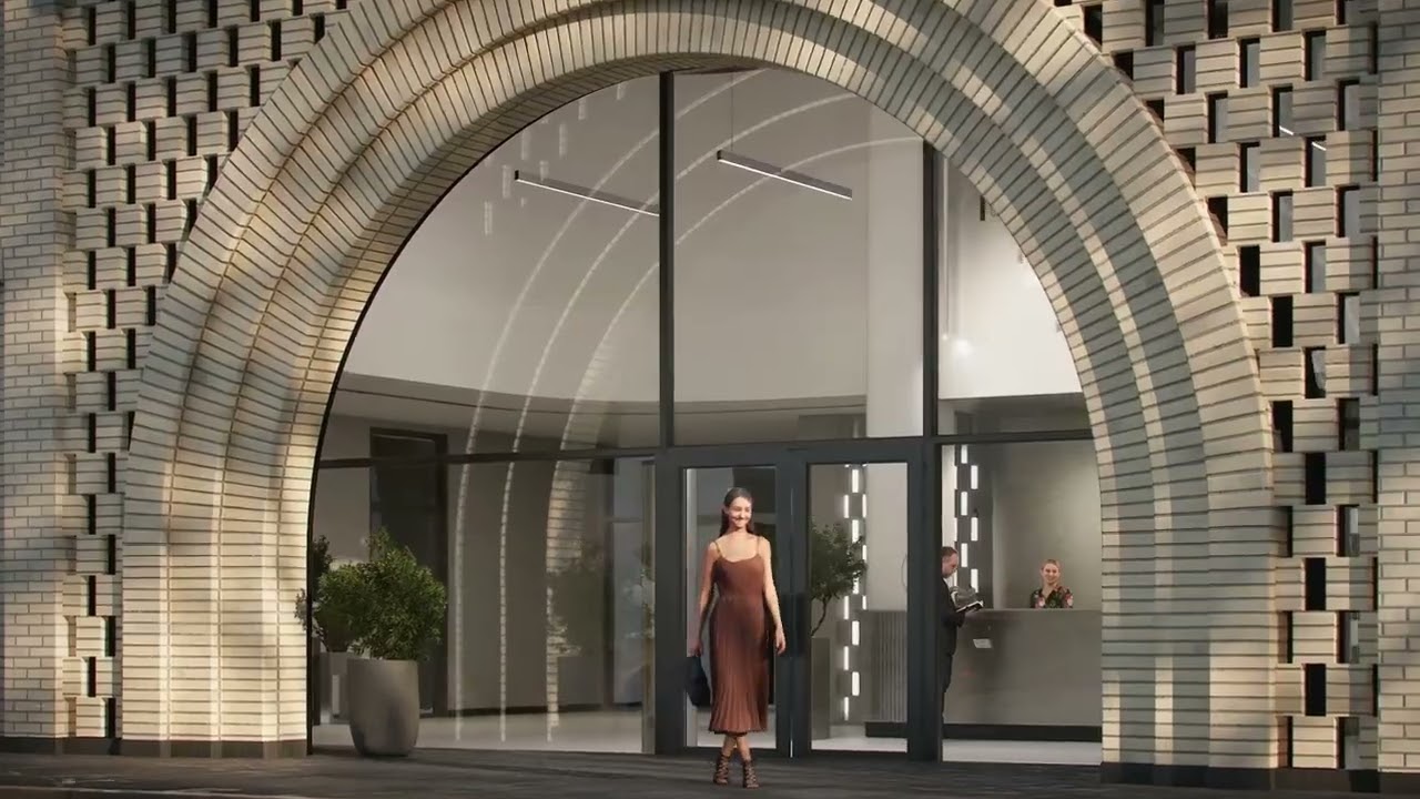 Полуциркульная арка парадного входа «Визионера», кирпич как дань традиции промышленной архитектуры, плавность фасадной пластики – скругленные углы зданий и плавные изгибы эркеров.